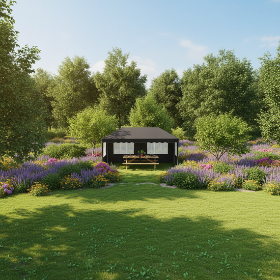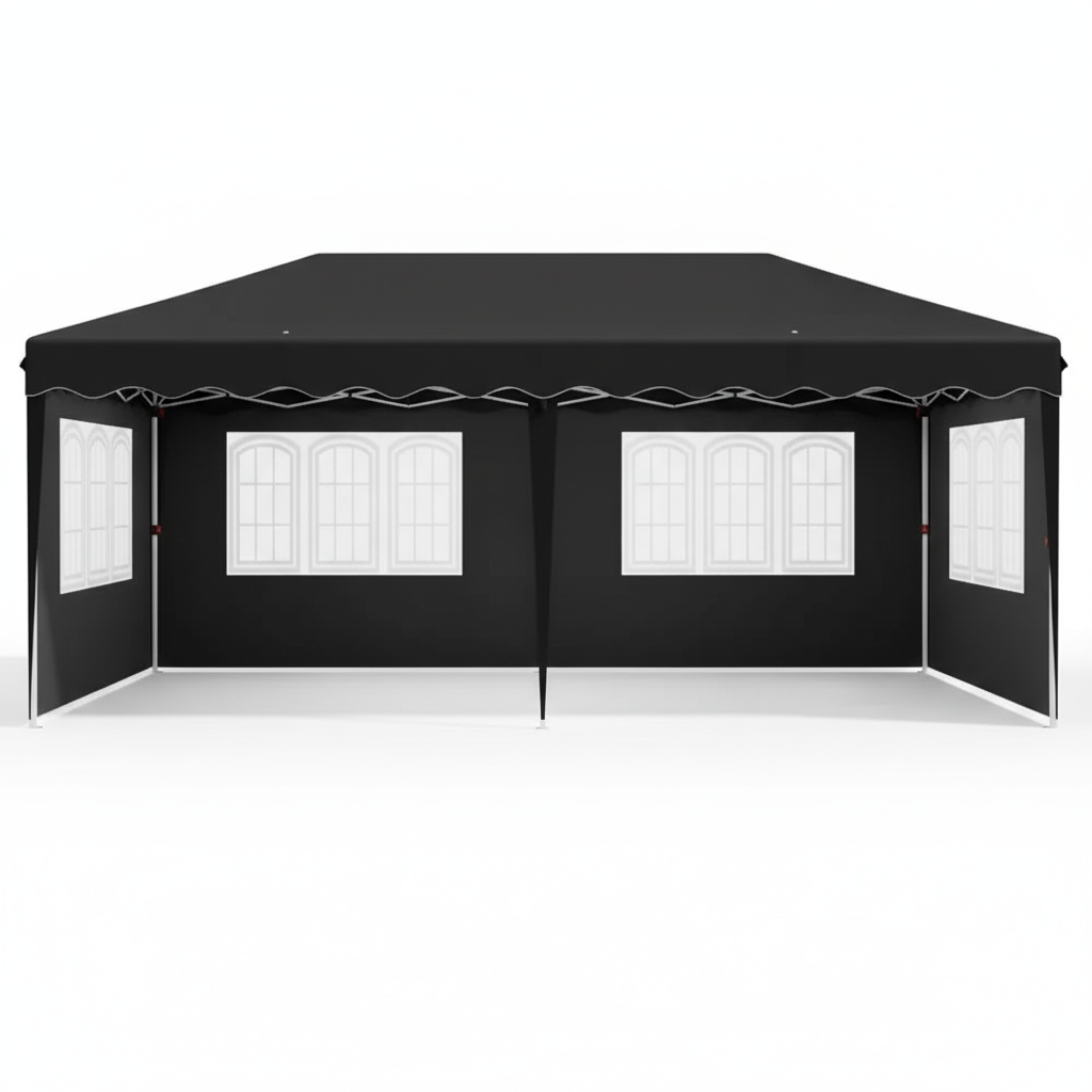 Les parois latérales incluses offrent une modularité précieuse : vous pouvez les installer pour créer un espace fermé et protéger vos invités du vent, ou les retirer pour garder un espace ouvert et convivial. Les fenêtres intégrées assurent luminosité et visibilité, transformant l’intérieur en un lieu agréable et lumineux.